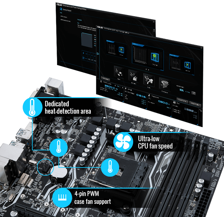 O exclusivo Fan Xpert garante que todas as ventoinhas tenham o melhor equilíbrio entre desempenho de refrigeração e baixo nível de ruído. As placas da série Prime A320 possuem o modo PWM/DC de 3-4 pinos para instalação das ventoinhas do gabinete, e você pode ajustá-las em configurações bem simples no BIOS.